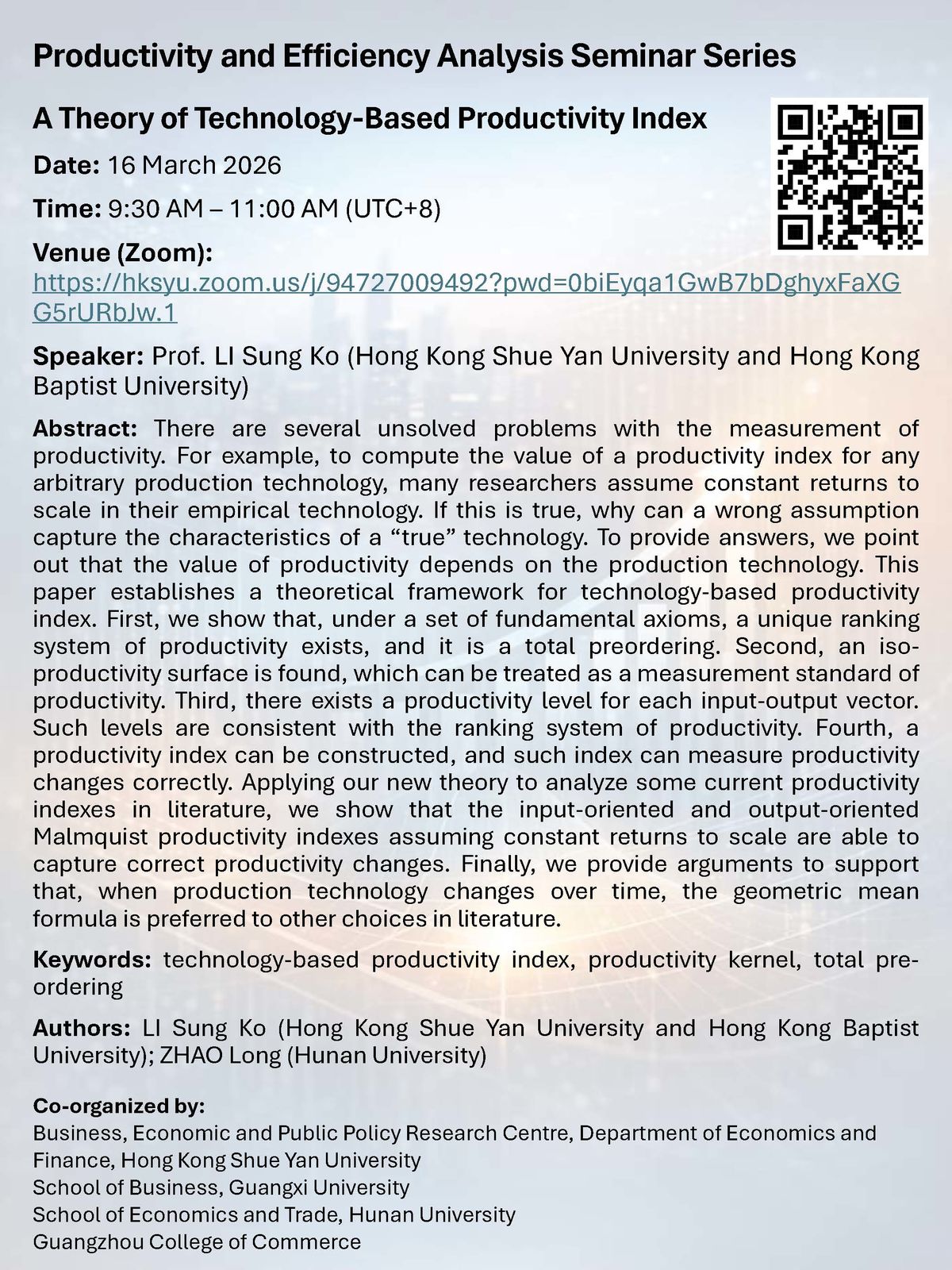 Productivity and Efficiency Analysis Seminar Series: A Theory of Technology-Based Productivity Index